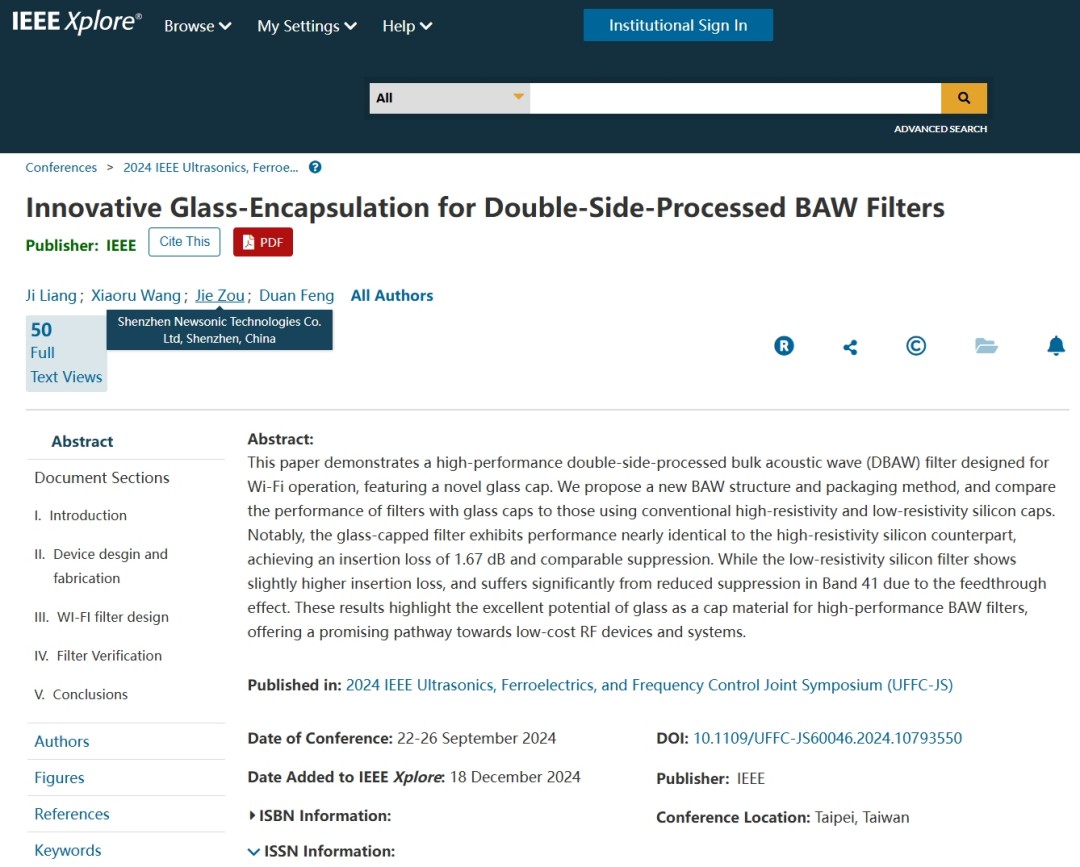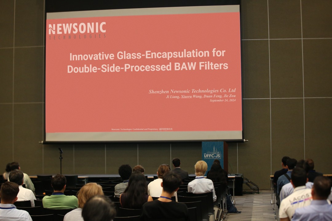 2024年9月22-26日,在中國臺北舉行的IEEE IUS 2024國際會議上,新聲半導體發布了標題為《Innovative Glass-Encapsulation for Double-Side Processed BAW Filters》的論文,并做口述報告。