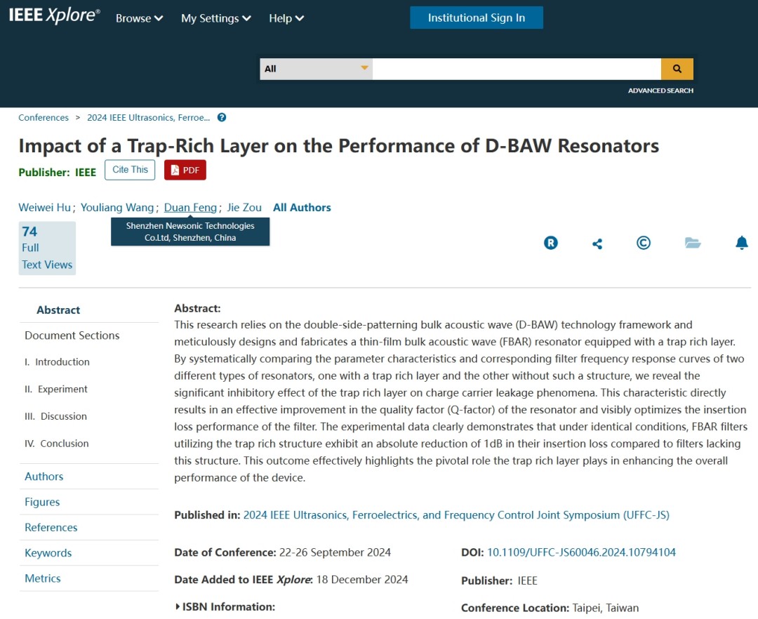 (中國·臺北,2024年9月22日-26日),新聲半導體研發團隊在IEEE IUS 2024發布了題為 《Impact of a Trap-Rich Layer on the Performance of D-BAW Resonators》突破性研究成果,并做口述報告。