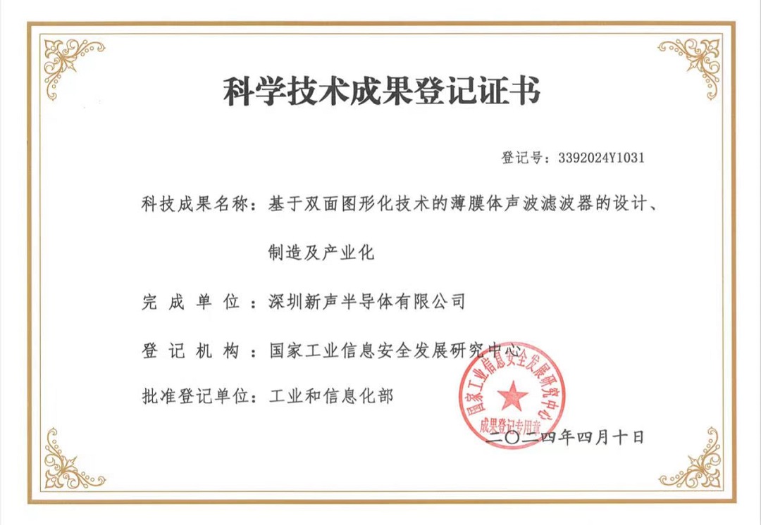 2024年4月,新聲半導(dǎo)體創(chuàng)新科技成果“基于雙面圖形化技術(shù)的薄膜體聲波濾波器的設(shè)計(jì)、制造及產(chǎn)業(yè)化”榮獲由工業(yè)和信息化部國(guó)家工業(yè)信息安全發(fā)展研究中心頒發(fā)的“科學(xué)技術(shù)成果登記證書(shū)”。這一榮譽(yù)不僅彰顯了新聲半導(dǎo)體在體聲波濾波器技術(shù)領(lǐng)域的卓越成就,更是對(duì)企業(yè)科技核心競(jìng)爭(zhēng)力和技術(shù)創(chuàng)新性及領(lǐng)先性的權(quán)威認(rèn)可。