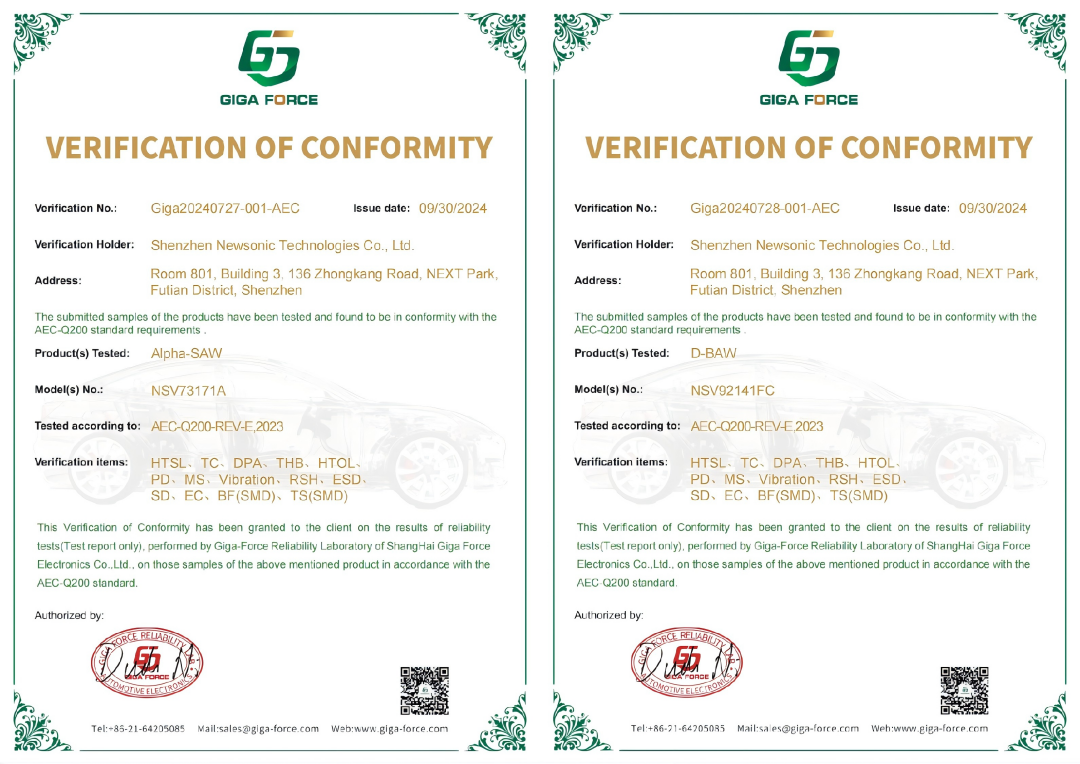 Recently, Newsonic's TC-SAW and BAW series of filter products have passed the AEC-Q200 automotive specification certification, marking Newsonic as the first filter company in China to pass the automotive-grade test certification.